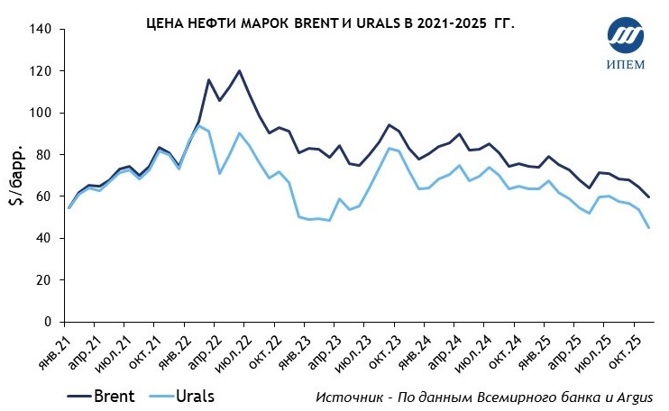 Главным фактором спада налоговых поступлений является снижение мировых цен на нефть: за 11 месяцев 2025 г. цена основных сортов нефти была на 14–15% ниже аналогичного периода прошлого года (см. рисунок). Цена Urals снизилась ниже «цены отсечения» в 60 $/барр. и достигла 45 $/барр. в ноябре 2025 г.