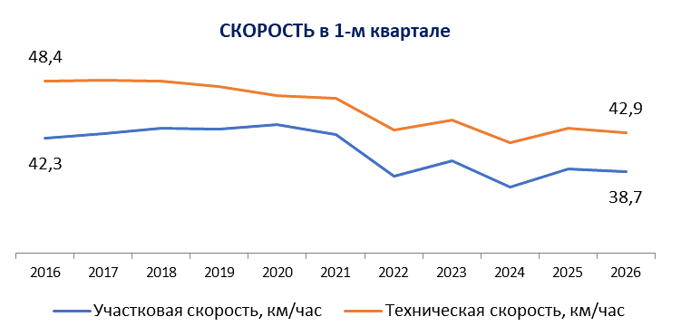 Техническая скорость (без учета стоянок) тоже снизилась. В 2016 году поезда по чистому перегону разгонялись в среднем до 48–49 км/ч. В первом квартале 2026 года — лишь 43 км/ч.