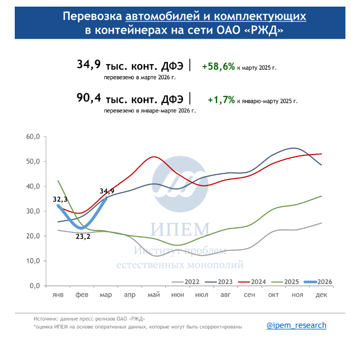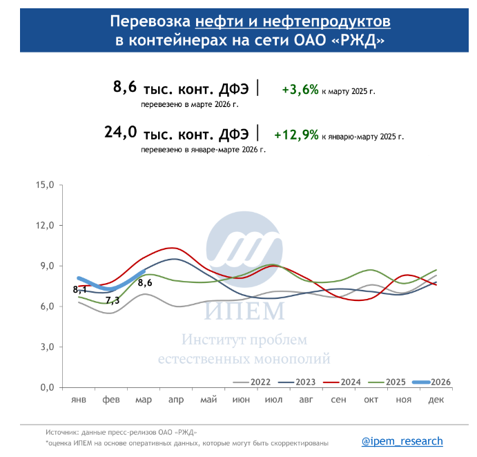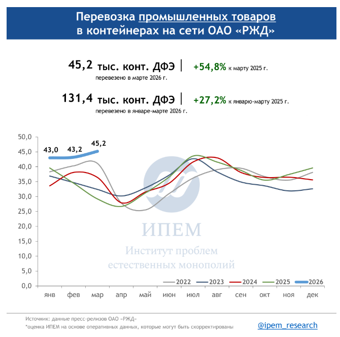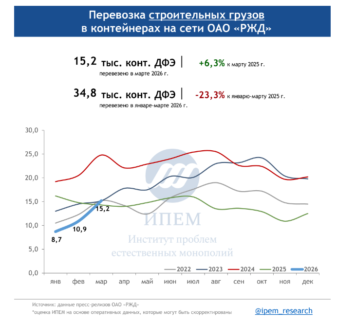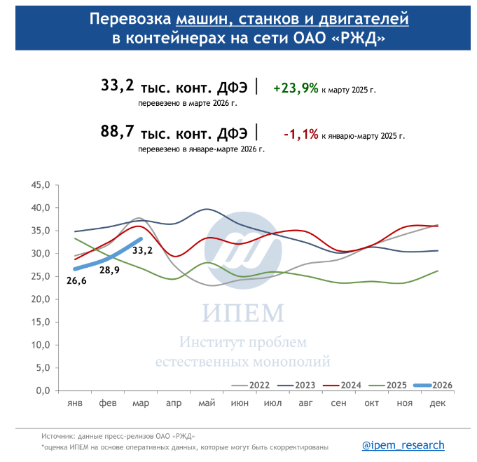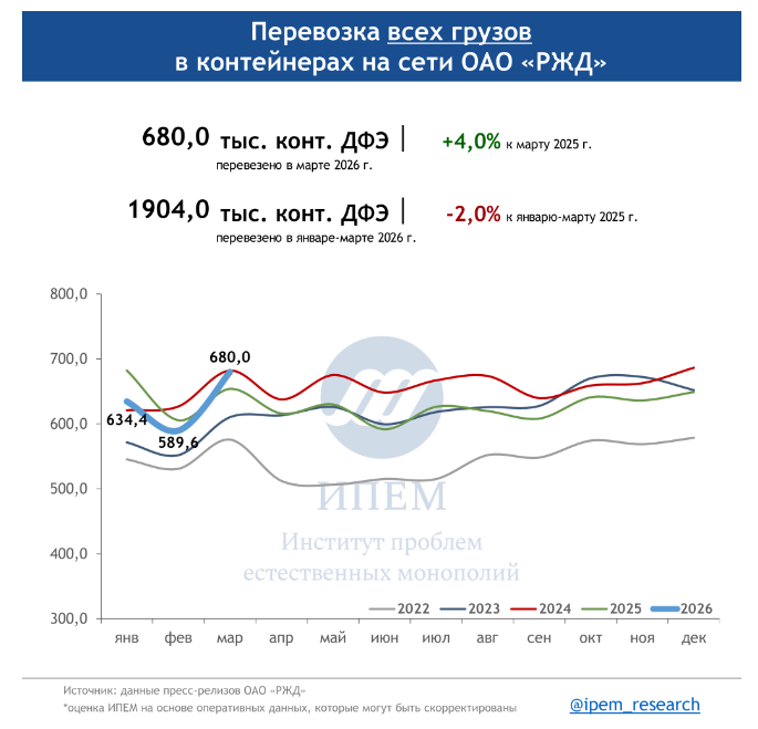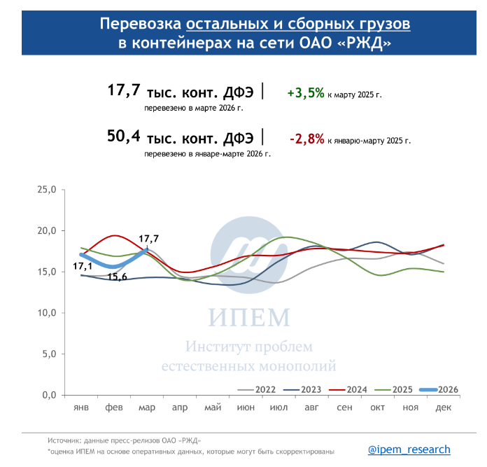 По данным ИПЕМ, в марте 2026 года сохраняются незначительные структурные сдвиги в сегменте грузоперевозок. На динамику в первом квартале повлияли погодные условия, изменения тарифов, а также перенаправление контейнерных мультимодальных маршрутов в обход морских путей из-за обострения ситуации на Ближнем Востоке.