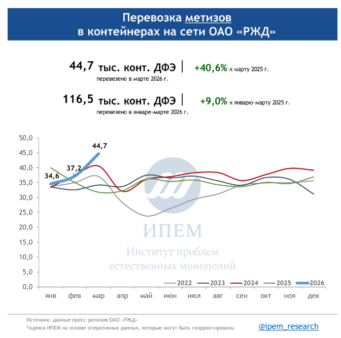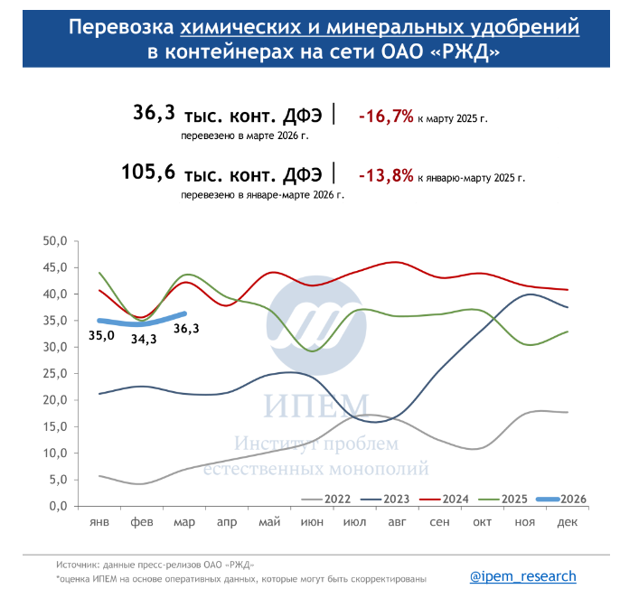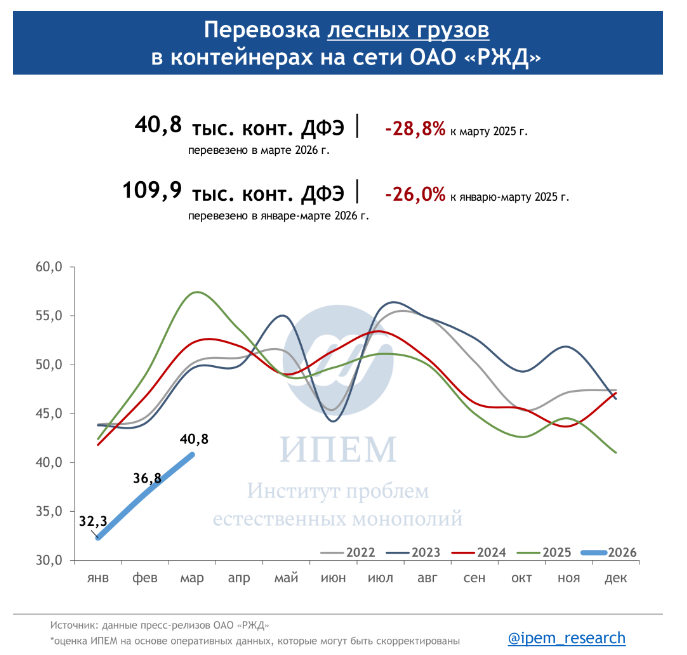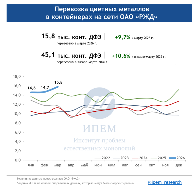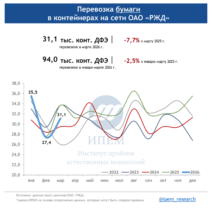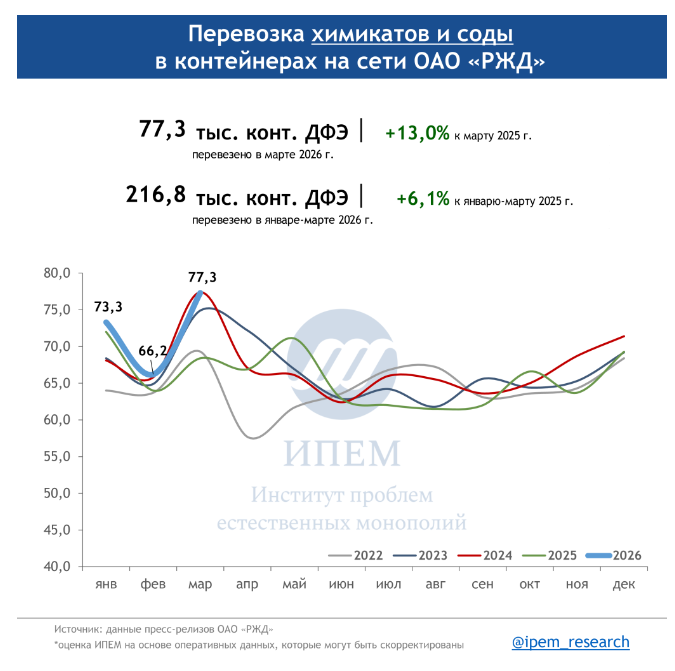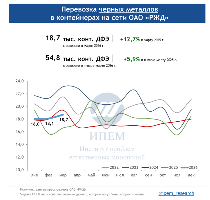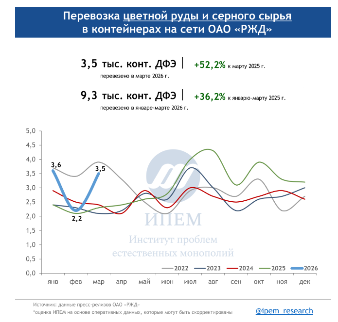 По данным ИПЕМ, в марте 2026 года сохраняются незначительные структурные сдвиги в сегменте грузоперевозок. На динамику в первом квартале повлияли погодные условия, изменения тарифов, а также перенаправление контейнерных мультимодальных маршрутов в обход морских путей из-за обострения ситуации на Ближнем Востоке.