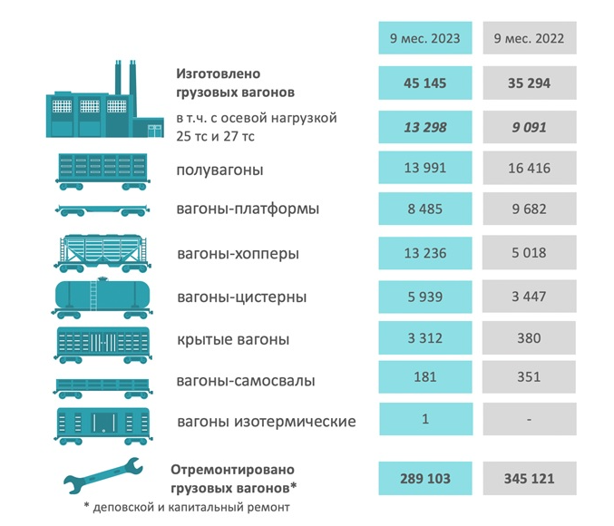 ОПЖТ представляет предварительные данные по выпуску грузового подвижного состава, а также его составных частей промышленными предприятиями Российской Федерации за 9 месяцев 2023 года.