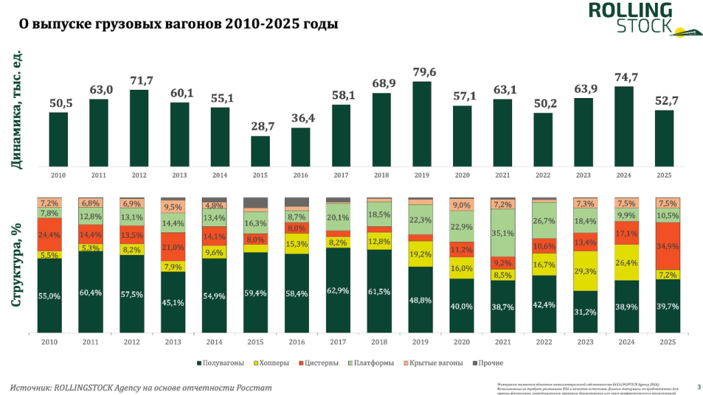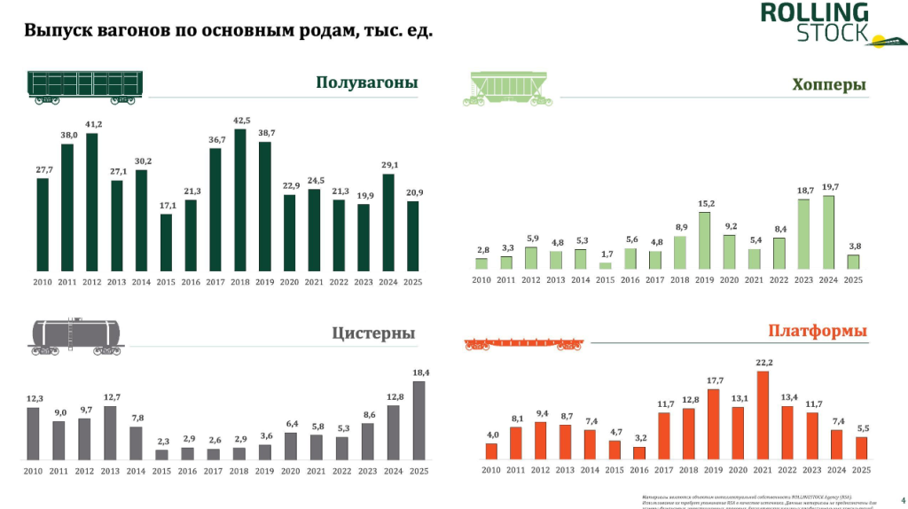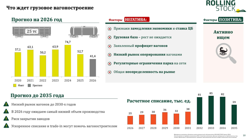 В 2026-м ожидаем сокращения выпуска по базовому сценарию до 41,4 тыс. вагонов. Негативных факторов много, от общей неопределенности на рынке до замедления экономики, а обоснованных позитивных факторов не видится. Ждем дно рынка в 2026-м, но и последующие годы выпуск вагонов будет ниже 2025-го.