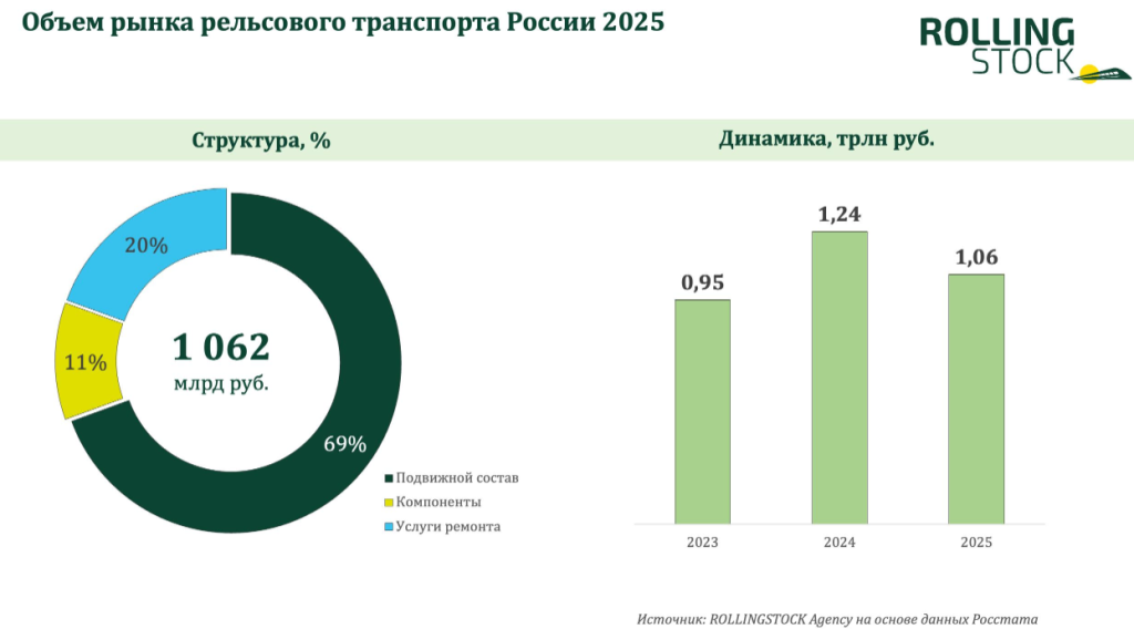 Как ранее и прогнозировал, в прошлом году общий объем рынка рельсового транспорта снова превысил рубеж в 1 трлн руб. Однако в то же время он сократился на 14,6% до 1 трлн 62 млрд руб.